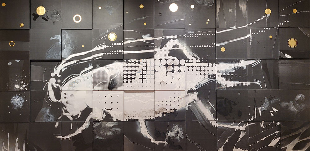 In the digital portrait Past/Future Tense, Hua explained that the layers are different iterations of the same image. “The aesthetic combines different ways that we create and see images,” he said. “I rendered the portrait with different dot sizes until they got progressively bigger, to the point where they almost got abstracted.”