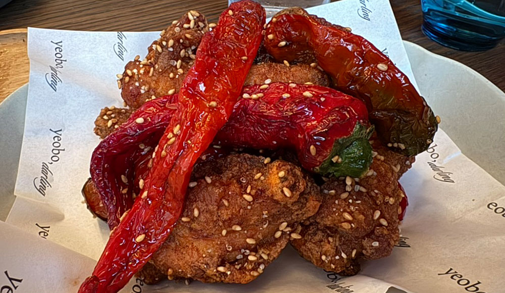 A plate of chicken wings ($20) changed my mind about the dish. Generally speaking, they’re a lot of fuss and bother to get one or two good bites. Yeobo’s, though, are all the right things—crisp and tender exactly where they ought to be. For a minute I did imagine that a dipping sauce, something light with soy, chili and vinegar, might be complementary. But that could have easily dampened the spice mix coating the skin. The plate also included some seared Jimmy Nardello peppers that were sweet and succulent.