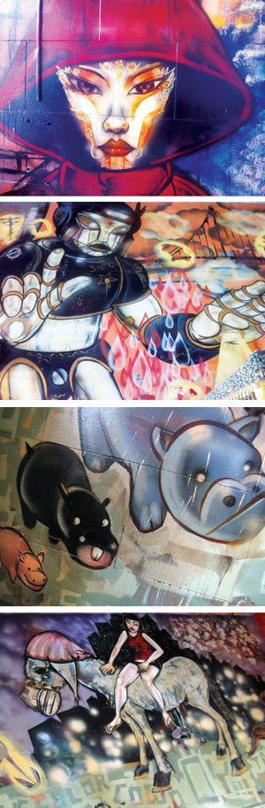 When Granado was getting ready to open 5 Color Cowboy in 2001, in a spot on The Alameda formerly occupied by Cafe Leviticus, he asked Choe to paint the particularly wretched north wall. Appreciation for Choe’s work aside, his motivation was fairly practical. “I knew he’d be able to turn this wall that looked like an outside wall into an interior space,” says Granado.